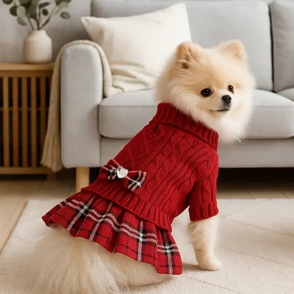 赤いセーターとチェックのスカートがセットになったワンピースです♡